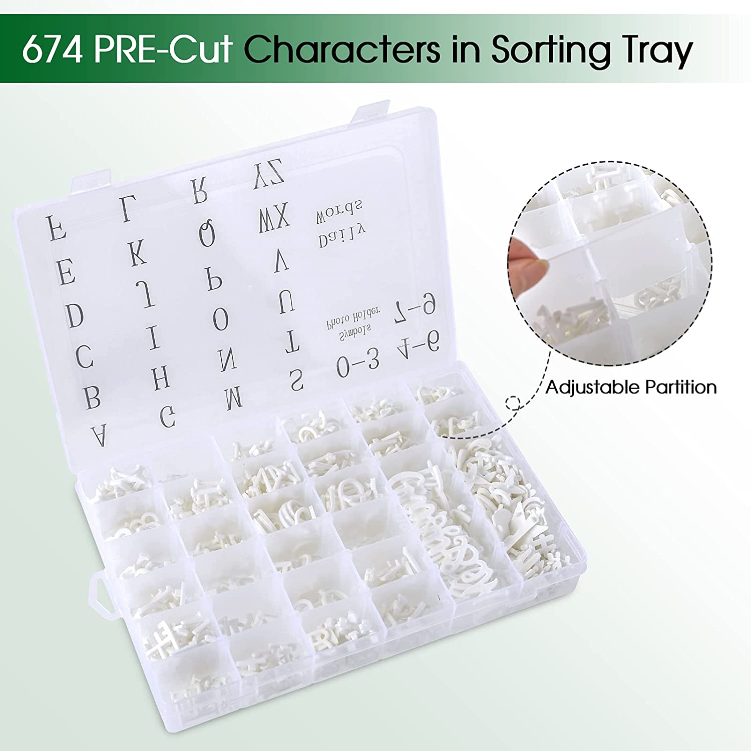 Letter Board Letters, 674 PRE-Cut Characters Letter Organizer Box (3/4 and 1 Inch) with Sorting Tray,White