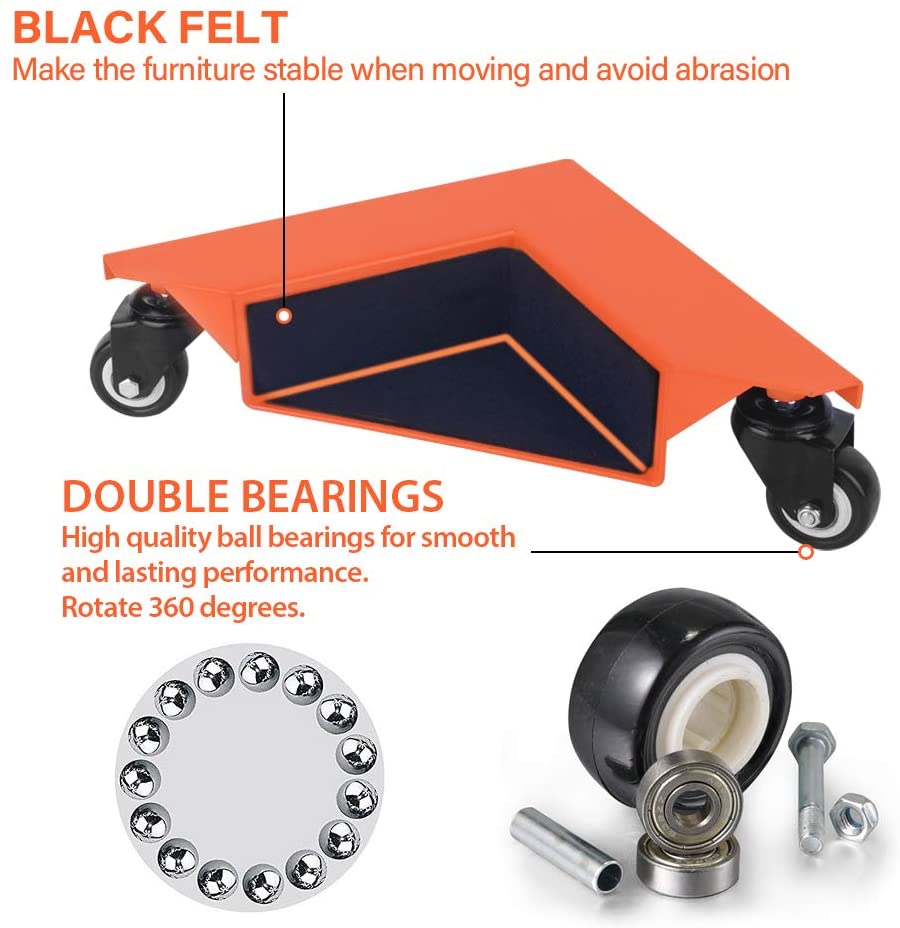 - EASY TO MOVE: Each roller base includes (3) ball-bearing 360-degree swivel polyurethane casters that have a 2-inch diameter and 0.8-inch width that are screwed to the base of the moving rollers for furniture; To use, first lift one side of the load with a jack and then slide one dolly furniture mover under each corner of the load, then repeat for the other side
