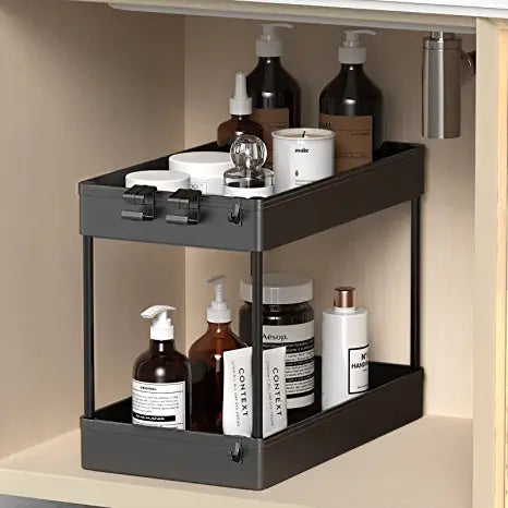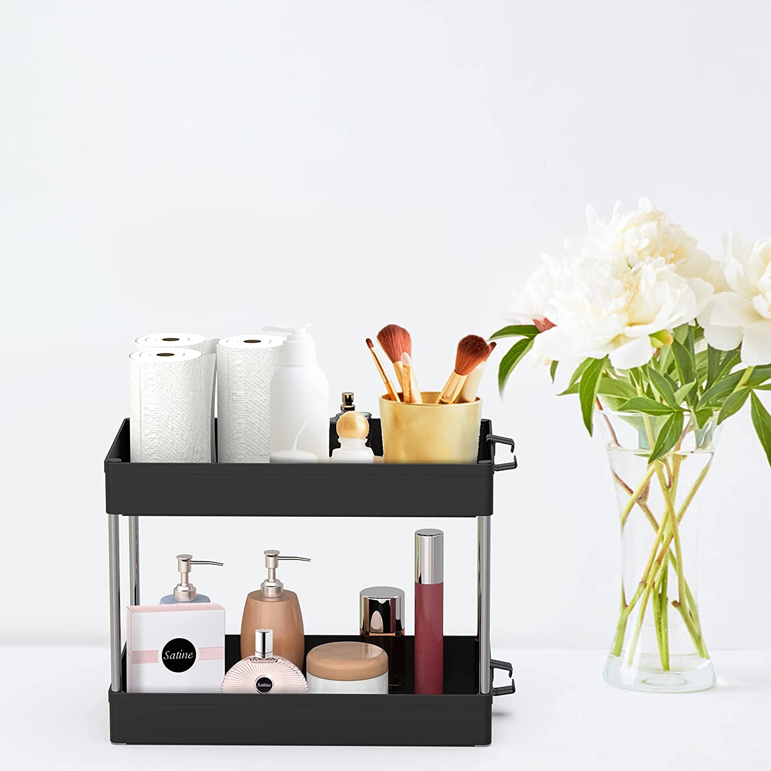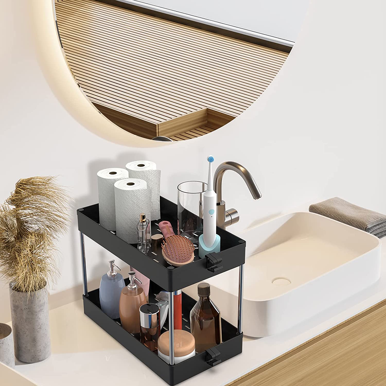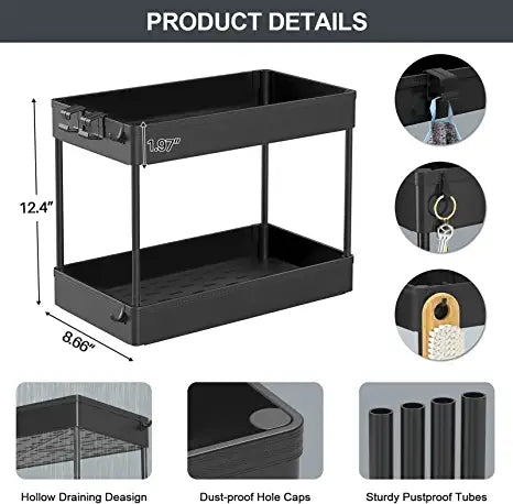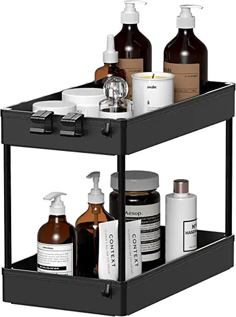 SPACEKEEPER Under Sink Organizer, 2 Tier Under Sink Storage Organizer, Bathroom Standing Rack, Bath Collection Slide-out Baskets with Hooks, Multi-purpose Storage Shelf for Bathroom Kitchen,Black