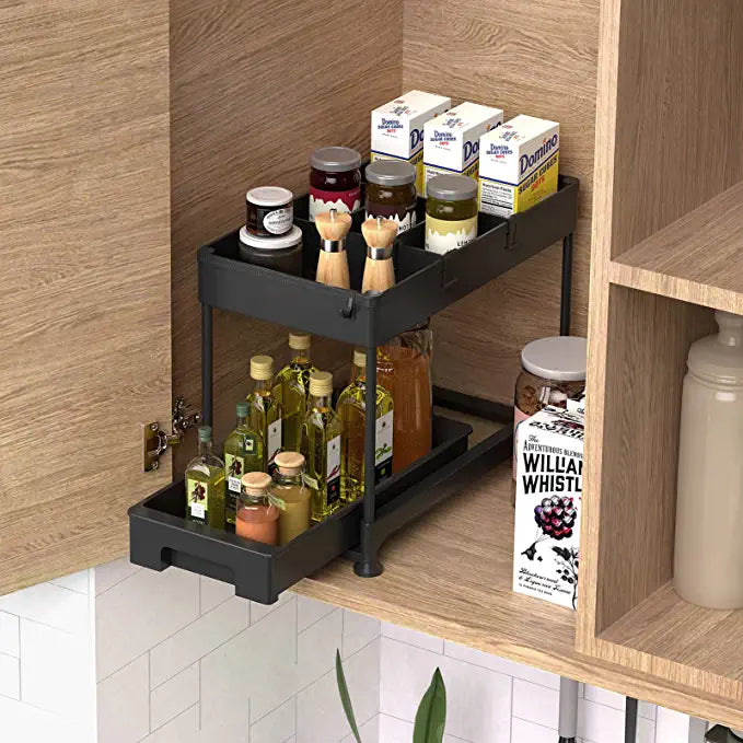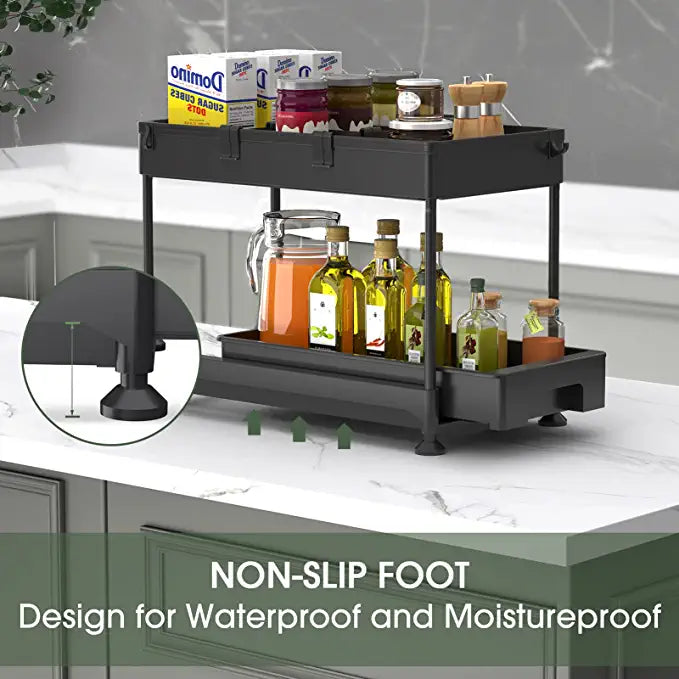- 【Save Space & Neatly Organized】- This under sliding cabinet organizer can make full use of the cabinet space, like kitchen under sink for cleaning supplies, bathroom under sink for toiletries and so on. Not only maximizes storage space utilization, but also makes the bottles and jars more neat and orderly.