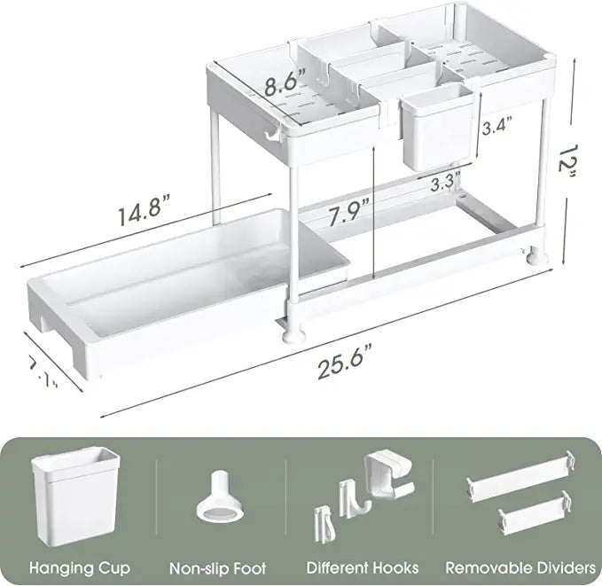 SPACEKEEPER Under Sink Organizer, Sliding Cabinet Basket Organizer 2 Tier Under Bathroom Storage Rack with Hooks, Hanging Cup, Dividers, Multi-purpose Storage Shelf for Bathroom Kitchen, White